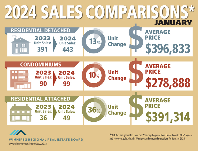 WINNIPEG, February 8, 2024 – January 2024 started with increases to MLS® sales, listings, dollar volume and average prices across all of the main three residential property types of residential detached, condominium and residential attached homes when compared to last January.