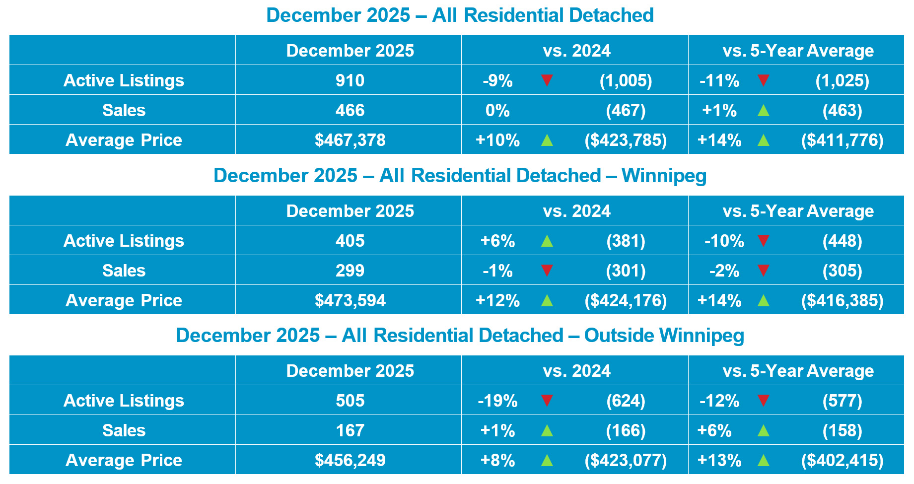 Winnipeg, January 8, 2026 – All MLS®1 sales of 752 in December 2025 were up 2% from December 2024 and up 4% from the 5-year average. Active All MLS® listings of 2,292 were down 4% and total MLS® dollar volume of over $297 million was up 9% from December 2024. Residential detached MLS® sales of 466 were statistically even while the average price of $467,378 was up 10% when compared to last year. Condominium MLS® sales of 129 were up 8% and the average price of $256,713 was down 6% from December 2024.