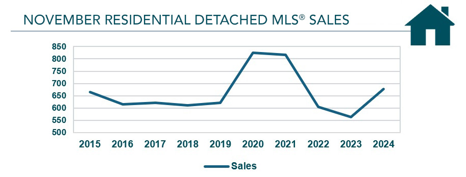 Winnipeg, December 10, 2024 – November saw All MLS® sales of 1,045 up 24% over November 2023, and 1% higher than the 5-year average. Active MLS® listings of 3,321 were down 12% from last November and total MLS® dollar volume of over $397 million up 40% from November 2023. Residential detached MLS® sales of 678 were up 20% while the average price of $433,968 was up 16% when compared to November 2023. Condominium MLS® sales of 153 were up 28% and the average price of $255,997 up 4% over last November.