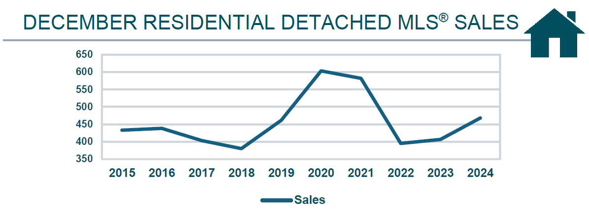 Winnipeg, January 9, 2025 – To close out 2024, December saw All MLS® sales of 742 up 19% over December 2023, and 3% lower than the 5-year average. Active MLS® listings of 2,393 were down 19% from last December and total MLS® dollar volume of over $272 million up 22% from December 2023. Residential detached MLS® sales of 468 were up 15% while the average price of $423,908 was up 4% when compared to December 2023. Condominium MLS® sales of 120 were up 18% and the average price of $272,728 up 1% over last December.