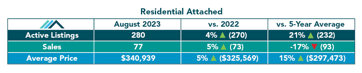 Of the 77 total MLS® residential attached home sales in August, 51 were in Winnipeg and the remaining 26 occurred outside Winnipeg. Of the 280 active MLS® listings for residential attached homes, 176 were in Winnipeg and 104 were outside Winnipeg. The average price for a residential attached home was 5% higher than last August and 15% higher than the 5-year average.