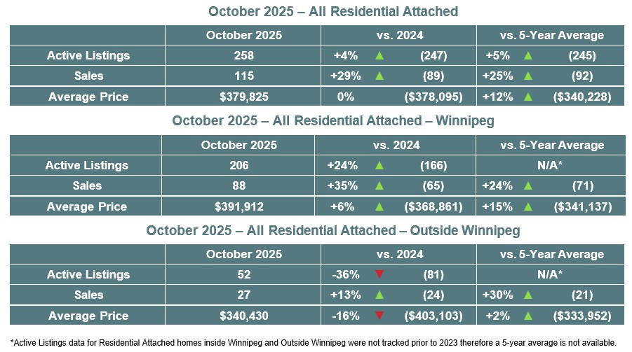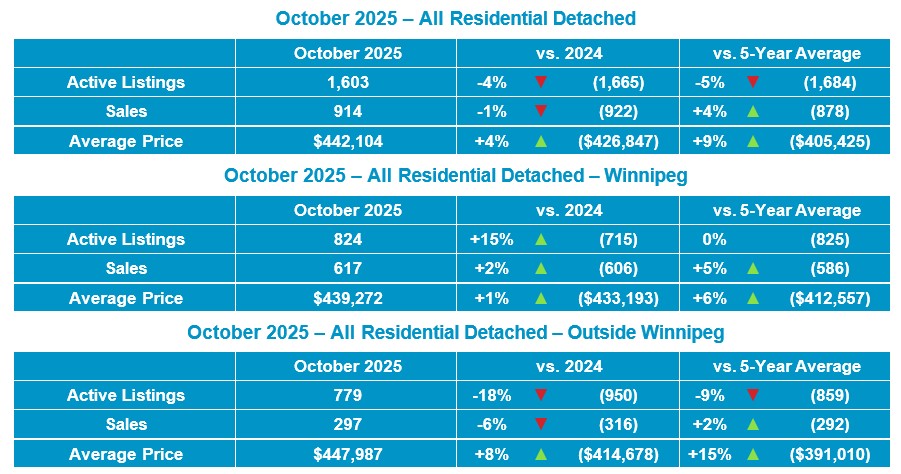 Winnipeg, November 6, 2025 – October 2025 saw All MLS® sales of 1,344 up 1% from October 2024 and up 6% from the 5-year average. Active MLS® listings of 3,519 were down 3% and total MLS® dollar volume of over $540 million up 7% from October 2024. Residential detached MLS® sales of 914 were down 1% while the average price of $442,104 was up 4% when compared to October 2024. Condominium MLS® sales of 171 were down 19% and the average price of $297,428 was up 12% from October 2024.