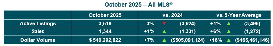 From a year-to-date perspective, All MLS® sales of 13,502 were up 5%, total MLS® listings of 20,679 statistically even while total dollar volume of over $5.4B up 12% from 2024. Year-to-date residential detached MLS® sales of 9,213 were up 4% and the average price of $453,260 was up 7% when compared to last October. Condominium MLS® sales of 1,941 were up 1% and the average price of $284,215 was up 3% above October 2024.