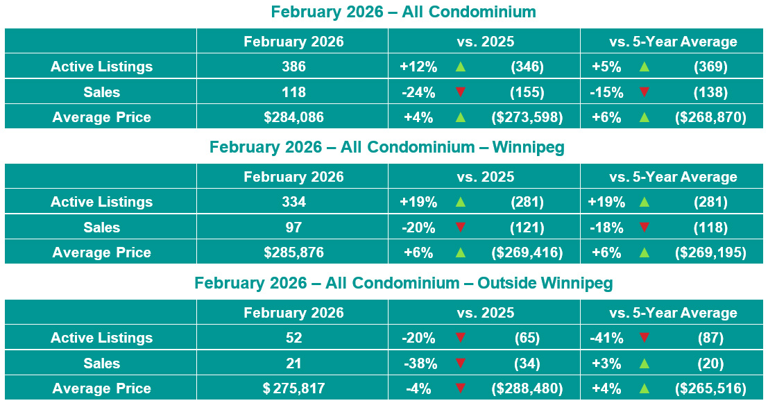 Winnipeg, March 5, 2026 – Residential detached average prices in February 2026 were statistically even with February 2025 while MLS® sales of 489 decreased 11% when compared to last year. Condominium average prices rose 4% to $284,086 and MLS® sales decreased 24% from February 2025. All MLS® sales of 786 in February 2026 were down 11%, active All MLS® listings of 2,563 were down 8% and total MLS® dollar volume of over $314 million was down 10% from February 2025.