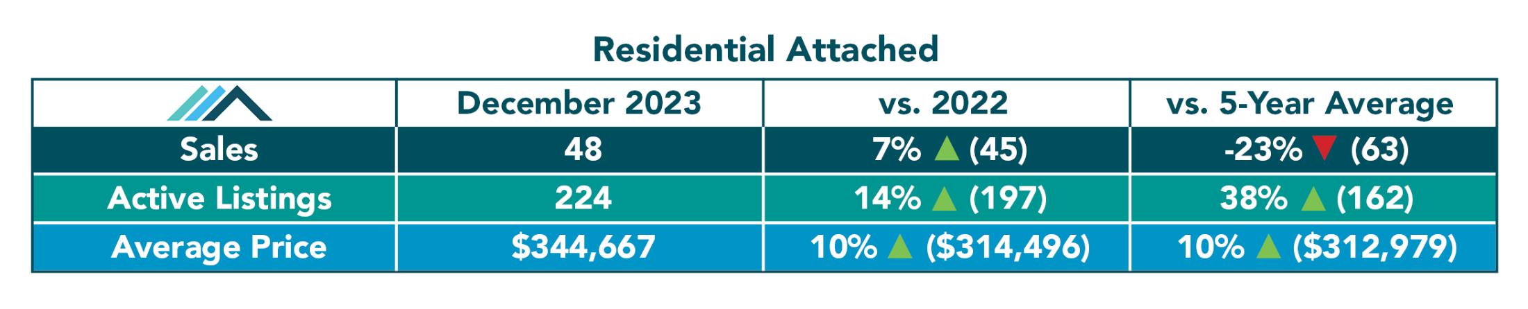 Of the 48 total MLS® residential attached home sales across the Winnipeg Regional Real Estate Board's market region in December, 35 were in Winnipeg and the remaining 13 occurred outside Winnipeg. Of the 224 active MLS® listings for residential attached homes, 131 were in Winnipeg and 93 were outside Winnipeg. The average price for a residential attached home was 10% above last December and the 5-year average.