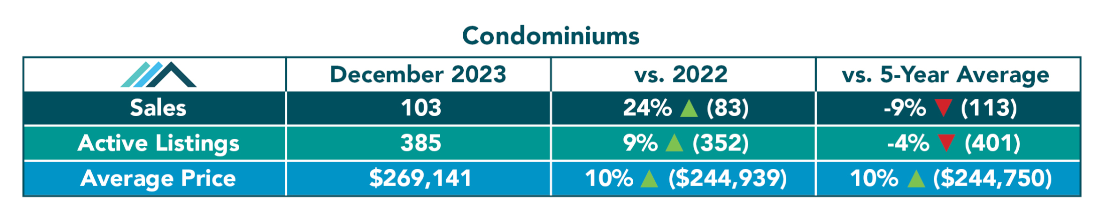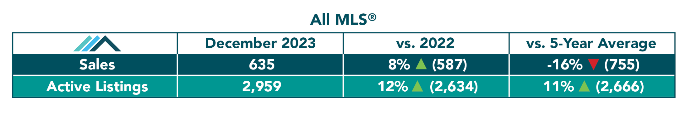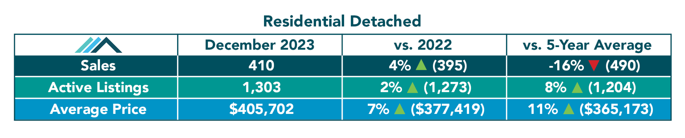 WINNIPEG, January 9, 2024 – December 2023 closed with total MLS® sales for all property types up over December of 2022. MLS® listings and dollar volumes were also up over last year which marks the 3rd time in 2023 where all three statistical categories were up in the same month. Average prices increased over last December for all three of the main MLS® property types of residential detached and residential attached, as well as condominium.