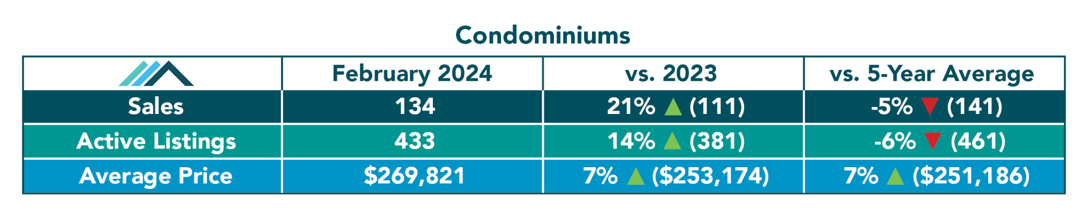 Of the 76 total MLS® residential attached home sales across the Winnipeg Regional Real Estate Board's market region in February, 54 were in Winnipeg and the remaining 22 occurred outside Winnipeg. Of the 227 active MLS® listings for residential attached homes, 130 were in Winnipeg and 97 were outside Winnipeg. The average price for a residential attached home decreased 9% from January, increased 5% from last February, and is up 10% above the 5-year average.