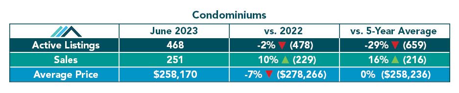The average price for a condominium in June was 7% below June of 2022 and even with the 5-year average. The average price in the first half of 2023 was 3% below the first half of 2022 and 3% higher than the 5-year average.