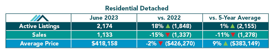 The average price for a residential detached home fell 2% over June of last year but is up 9% over the 5-year average. Meanwhile, the average price for the first half of 2023 is down 8% over the first half of 2022 but is up 7% over the 5-year average.