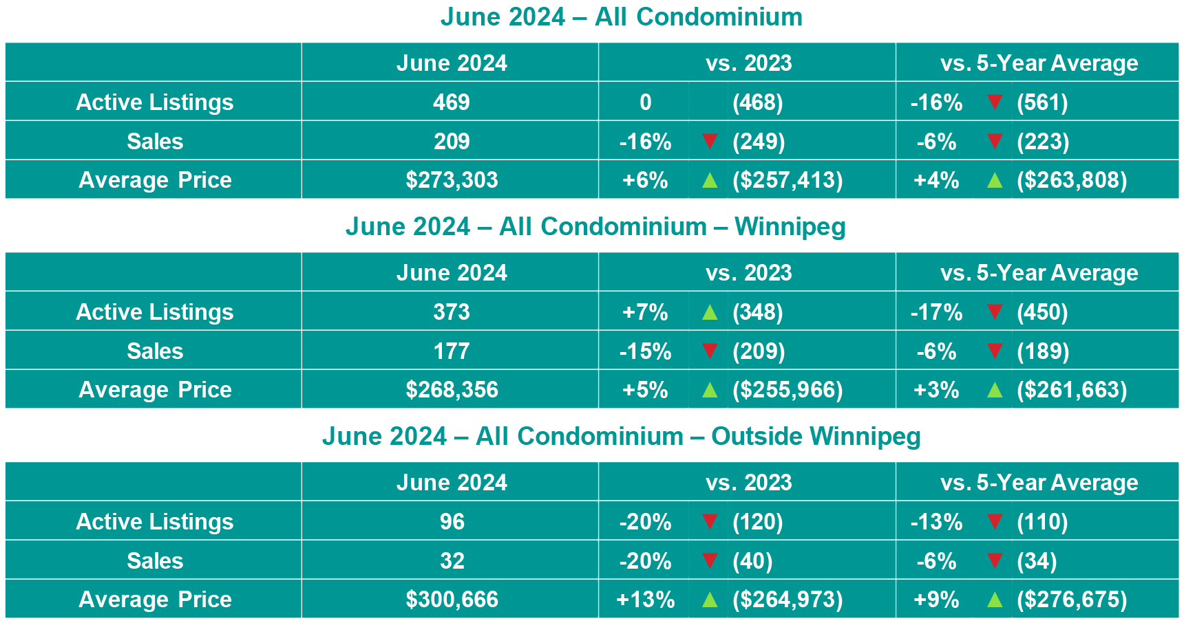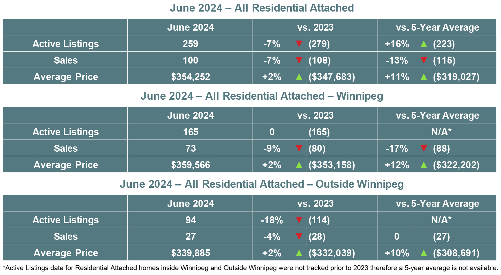 Winnipeg, July 9, 2024 – The first-half real estate market results for 2024 across the Winnipeg Regional Real Estate Board's market region saw All MLS® sales of 7,288 up 13% over 2023. MLS® listings of 12,399 were up 4% while dollar volume of $2.8B was up 20% over 2023. First-half 2024 residential detached MLS® sales of 4,979 were up 11% and the average price of $424,193 was up 6% when compared to last June. First-half 2024 condominium MLS® sales of 1,119 were up 13% and the average price of $277,252 was up 9% over last June while residential attached MLS® sales of 522 were up 15% and the average price of $365,719 up 9% over last year.
