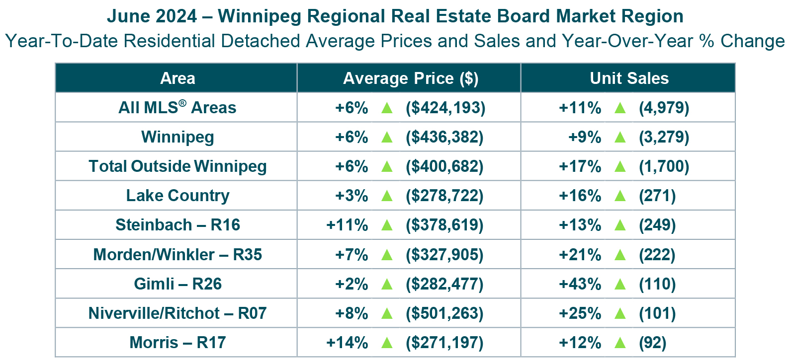 “The first-half MLS® sales and dollar volume results for 2024 represent the 3rd best market performance on record with the 2nd best in 2022 and the best in 2021," said Daphne Shepherd, 2024-2025 President of the Winnipeg Regional Real Estate Board. “Average prices continued to increase for residential detached, condominiums, and residential attached homes in June and for the first half when compared to last year and the 5-year averages."