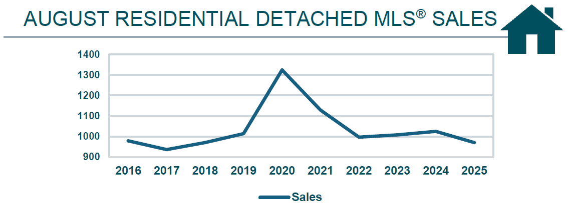 From a year-to-date perspective, All MLS® sales of 10,773 were up 5%, total MLS® listings of 16,635 down 1% while total dollar volume of over $4.3B up 12% over 2024. Year-to-date residential detached MLS® sales of 7,367 were up 5% and the average price of $456,726 was up 8% when compared to last August. Condominium MLS® sales of 1,571 were up 2% and the average price of $281,261 was up 2% above August 2024.