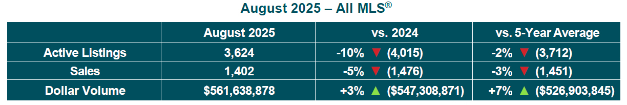 All MLS® sales decreased compared to August 2024 and the 5-year-average while total dollar volume rose above August 2024 and the 5-year average. MLS® sales for residential detached homes and condominiums fell below August 2024 while only condominiums rose above the 5-year average. Average prices and dollar volume for residential detached homes and condominiums increased over August 2024 and the 5-year average. All MLS®, residential detached and condominium listings were down from August 2024 and the 5-year average.