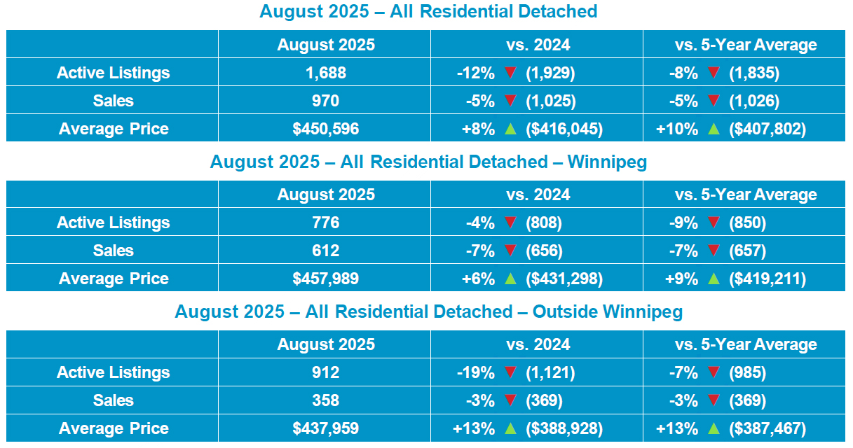 Winnipeg, September 9, 2025 – August 2025 saw All MLS® sales of 1,402 down 5% from August 2024 and down 3% from the 5-year average. Active MLS® listings of 3,624 were down 10% and total MLS® dollar volume of over $561 million up 3% from August 2024. Residential detached MLS® sales of 970 were down 5% while the average price of $450,596 was up 8% when compared to August 2024. Condominium MLS® sales of 204 were down 3% and the average price of $280,143 was up 4% from August 2024.