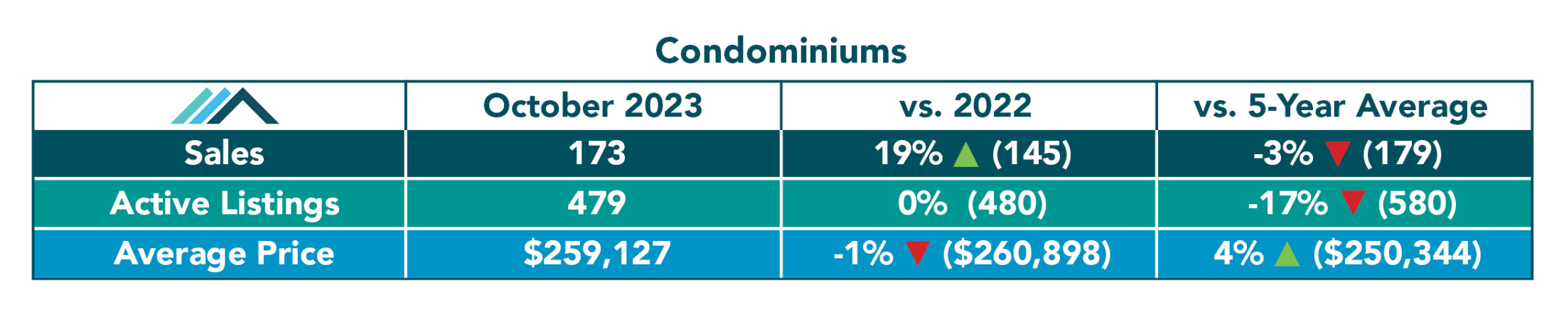Of the 173 total MLS® condominium sales across the Winnipeg Regional Real Estate Board's market region in October, 147 were in Winnipeg and the remaining 26 occurred outside Winnipeg. Of the 479 active MLS® listings for condominiums, 373 were in Winnipeg and 106 were outside Winnipeg.