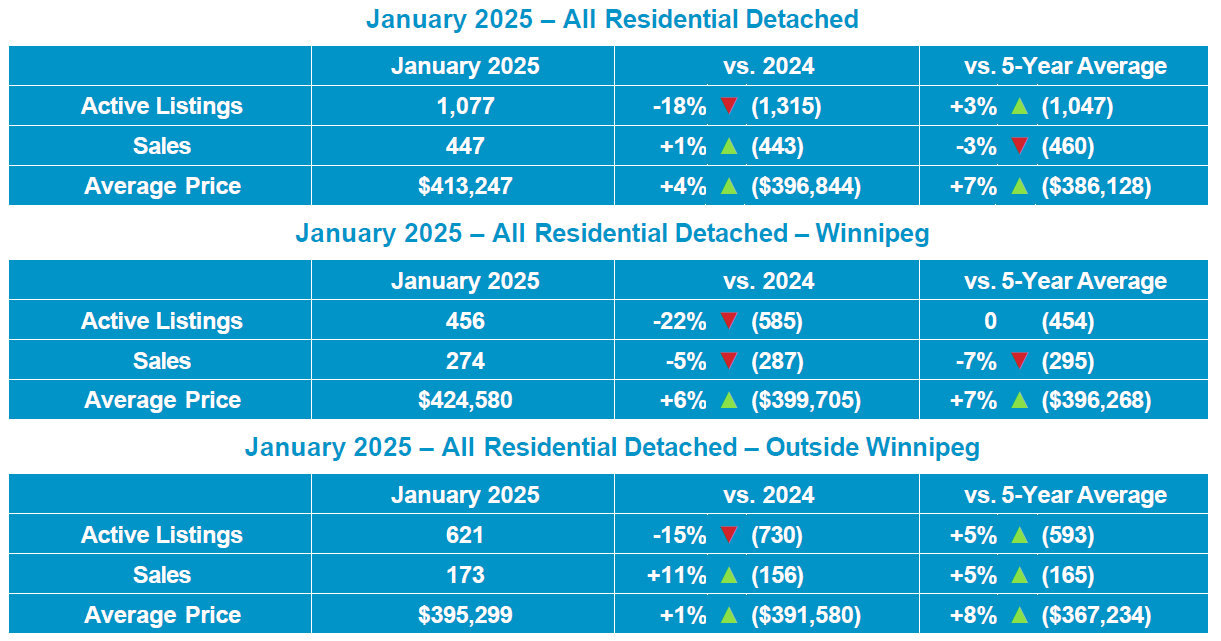 Winnipeg, February 7, 2025 – January saw All MLS® sales of 722 up 10% over January 2024, and 1% above the 5-year average. Active MLS® listings of 2,597 were down 14% from last January and total MLS® dollar volume of over $258 million up 9% from January 2024. Residential detached MLS® sales of 447 were up 1% while the average price of $413,247 was up 4% when compared to January 2024. Condominium MLS® sales of 111 were up 12% and the average price of $249,793 down 10% over last January.