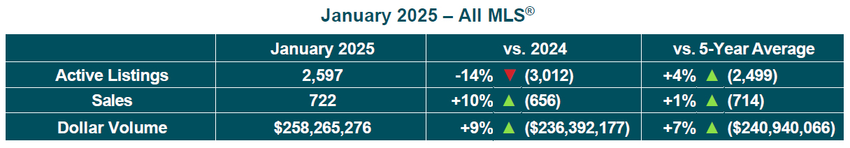 January 2025's real estate market performance saw increases to All MLS® sales, and dollar volume when compared to last January and the 5-year average. All MLS® active listings were down from January 2024 but up from the 5-year average. Residential detached, condominium, and residential attached homes saw increases to MLS® sales over 2024 while only residential detached homes fell below the 5-year average. Dollar volumes were up over last year for residential detached and attached homes while condominiums were statistically even but all three rose above the 5-year average. Average prices for residential detached homes were above last year and the 5-year average while condominiums and residential attached homes were below last year but above the 5-year average.
