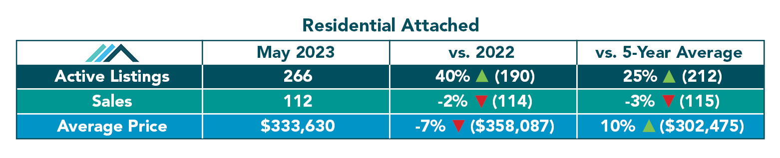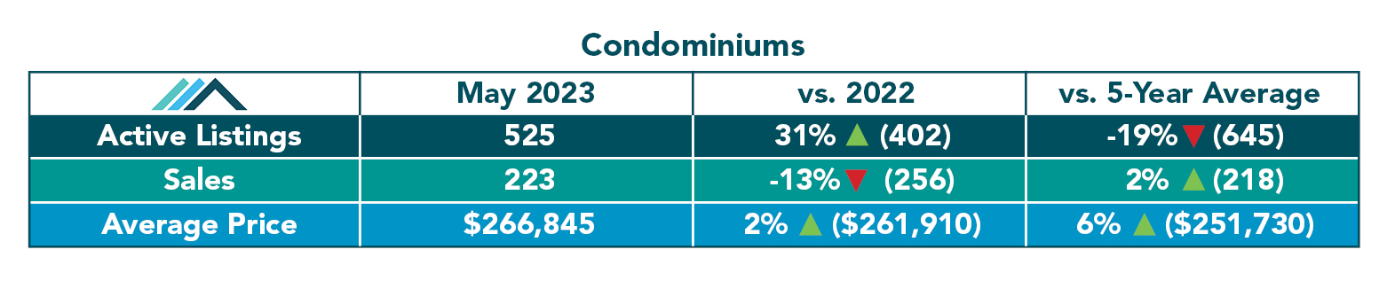 May MLS® sales for condominiums are the first of the three main property types of residential detached, condominiums and residential attached, to rise above the 5-year average in 2023. At the same time, active listings for condominiums in May were the only one of the three property types that were below the 5-year average.