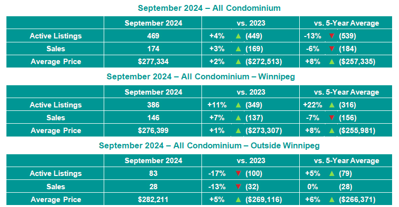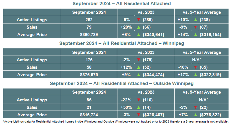"The upward trend in MLS® sales, dollar volume, and average prices in 2024 continued across the three primary property types: residential detached, residential attached and condominiums. This month, these gains also exceeded those of September 2022," said Daphne Shepherd, 2024-2025 President of the Winnipeg Regional Real Estate Board. “Year-to-date totals for 2024 showed increases in listings, MLS® sales, dollar volume, and average prices compared to 2023. Condominiums had a particularly strong performance, being the only property type to exceed the 5-year average for MLS® sales through the first three quarters. Additionally, September marked the fifth condominium MLS® sale of 2024 at or above $1 million."