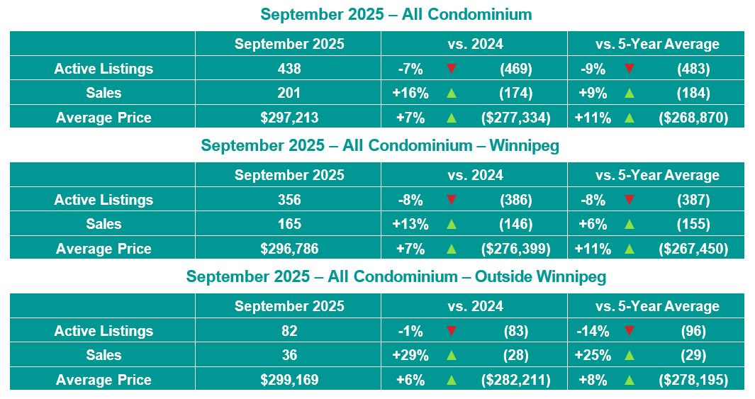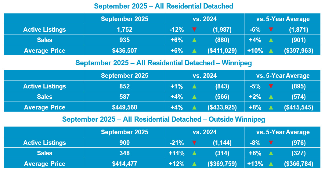 Winnipeg, October 7, 2025 – September 2025 saw All MLS® sales of 1,391 up 12% from September 2024 and up 7% from the 5-year average. Active MLS® listings of 3,704 were down 8% and total MLS® dollar volume of over $547 million up 17% from September 2024. Residential detached MLS® sales of 935 were up 6% while the average price of $436,507 was up 6% when compared to September 2024. Condominium MLS® sales of 201 were up 16% and the average price of $297,213 was up 7% from September 2024.