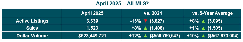 For April 2025, All MLS® sales and dollar volume were up when compared to last April and the 5-year average. All MLS® active listings were down from April 2024 but up from the 5-year average. Residential detached homes saw increases to MLS® sales, dollar volume and average prices over April 2024. Condominiums, on the other hand, saw decreases to MLS® sales, dollar volume and average prices.