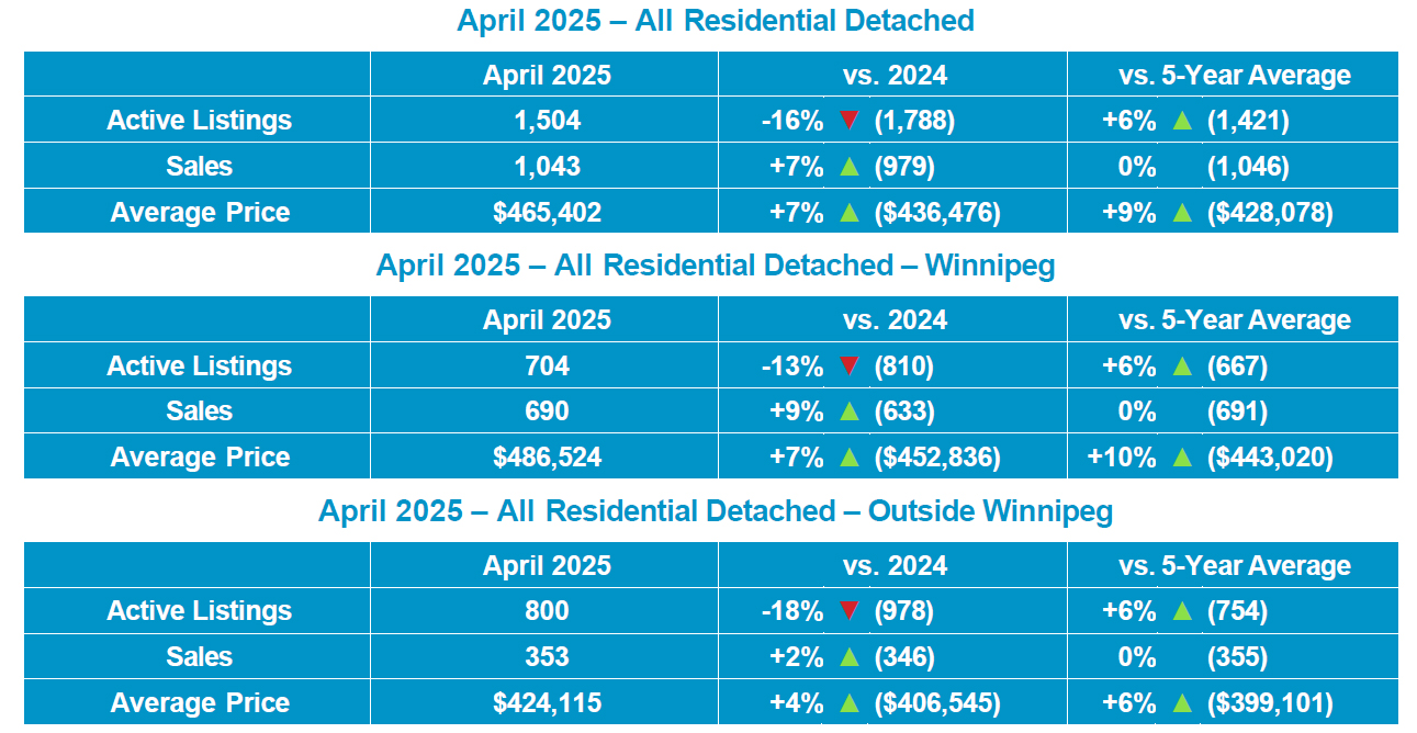 Winnipeg, May 7, 2025 – April’s real estate market performance saw All MLS® sales of 1,523 up 8% over April 2024 and 1% above the 5-year average. Active MLS® listings of 3,339 were down 13% from last April and total MLS® dollar volume of over $623 million up 12% from April 2024. Residential detached MLS® sales of 1,043 were up 7% while the average price of $465,402 was up 7% when compared to April 2024. Condominium MLS® sales of 206 were down 4% and the average price of $274,483 down 4% over last April.